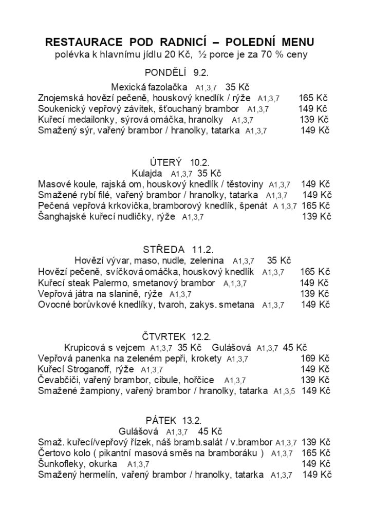 • výběr z cca 5 českých jídel v cenách 140 – 155,- Kč